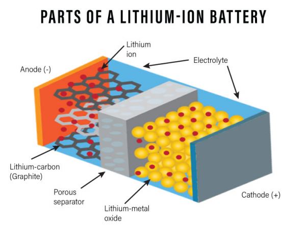 - Li-ion batteries consist of two electrolyte compartments kept apart by a separator.