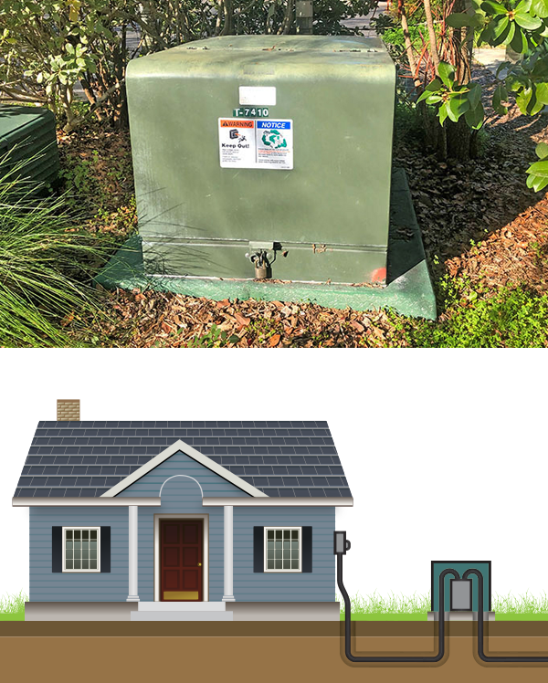 An underground service wire runs from a buried distribution line or pad-mounted transformer to a customer’s meter. Like underground power lines, these wires may either be direct buried or run through a metal or plastic conduit.