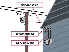 An overhead service wire runs from a distribution line or transformer to a weatherhead on the roof or side of a structure. The service wire may appear as a single wire or as three wires twisted together. A hollow steel tube called a service mast carries the service wires from the weatherhead to the meter.