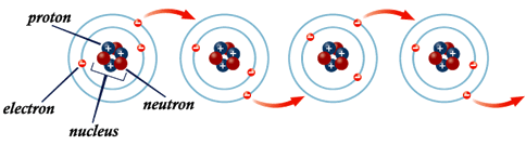 Everything around us is made of tiny particles called atoms. In the center of an atom is its nucleus. Smaller particles called electrons orbit the nucleus. When the negatively charged electrons move between atoms, this creates electricity. Electricity is energy caused by the movement of electrons.